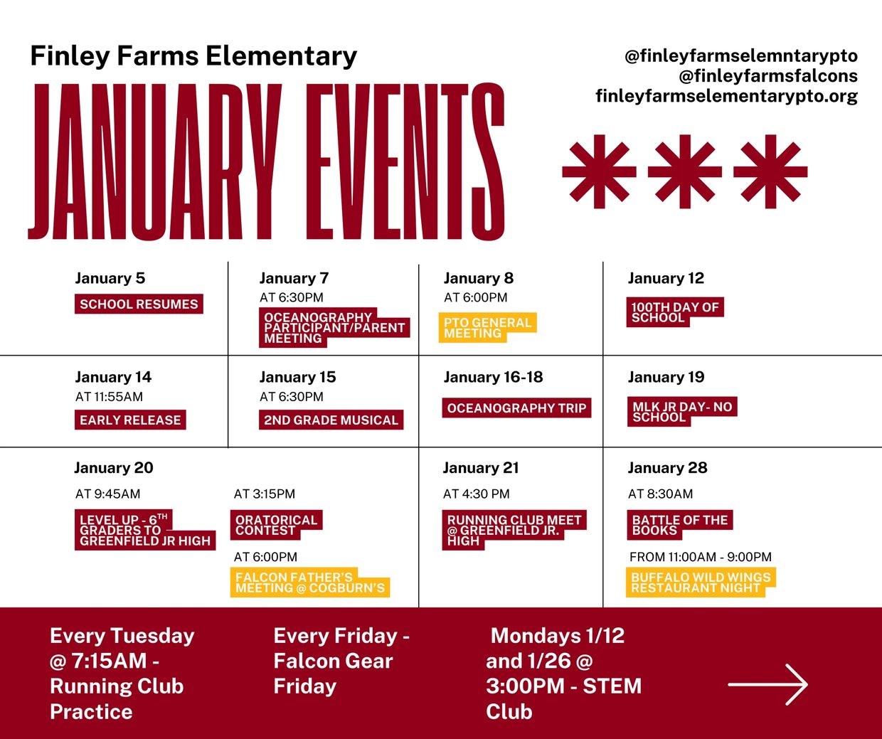 This is the place to join the PTO, reach out to us, and stay in the loop on fundraisers, events, and volunteer opportunities at our school. Whether you're a new or returning member, we invite you to use this site as your go-to guide for everything happening at Finley Farms. Check back often to see what your Falcons are up to—and how you can be part of the fun!